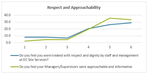 One of the most important questions in our staff surveys was how approachable you feel our managers and team leaders are, and if you feel that you're treated with respect when working with us. The response received was mixed with 89% of it positive for approachability but only 73% positive regarding respect and dignity.